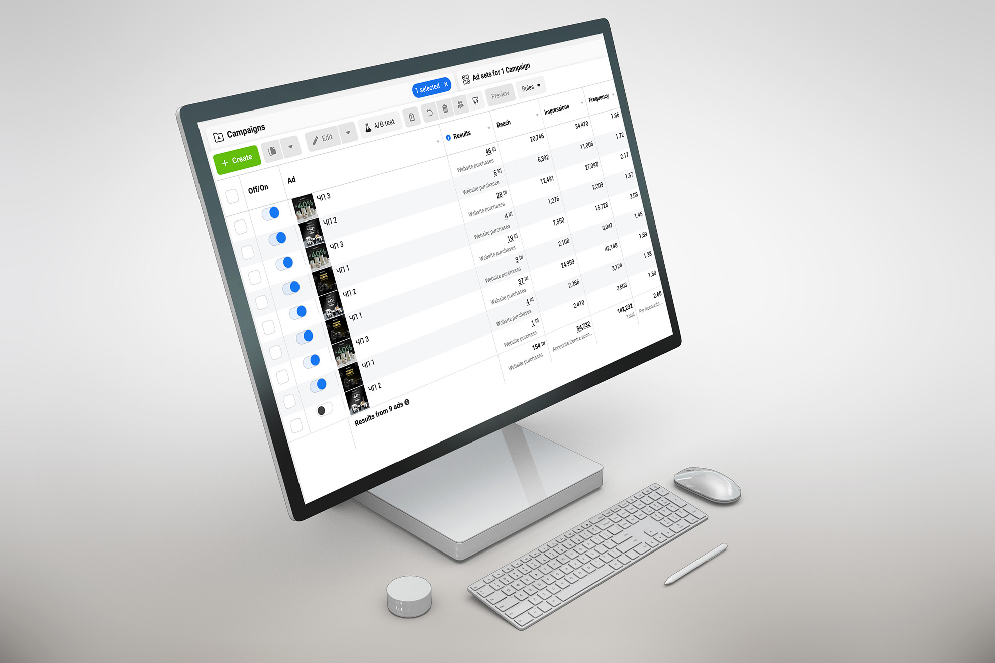 The next stage was the development of designs. By this point, we always approach it carefully. We prepared static visual visuals in advance, in case any of them didn't work, so we could replace them promptly. Naturally, the emphasis in the visual part was on the discount size, brand logo, and product.Setting up advertising campaigns.